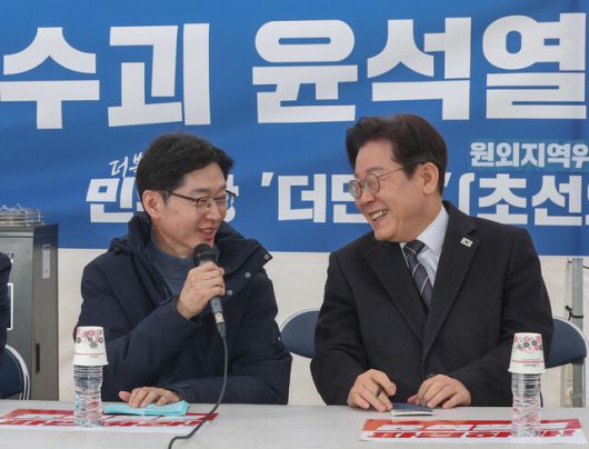 이재명 더불어민주당 대표(오른쪽)와 김경수 전 경남지사가 12일 서울 종로구 경복궁 앞 더불어민주당 천막 농성장에서 열린 국난극복을 위한 시국간담회에서 대화하고 있다. 공동취재사진 |