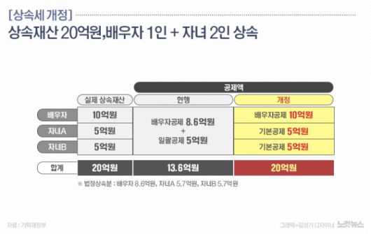 그동안 △일괄공제 5억 원을 받거나 △기초공제 2억 원에자녀 및 장애인, 연로자, 미성년자 등 각종 인적 공제분을 더한 값 중 하나를 골라 공제받았는데, 개편안에서는 1인당 5천만 원이었던 자녀 공제를 일괄공제에 준하는 5억 원으로 대폭 늘려 단순화했다. 또 배우자에 대해서는 취득한 상속재산이 10억 원 이하라면 법정상속분을 따지지 않고 전액 공제해 세부담을 대폭 낮췄다.