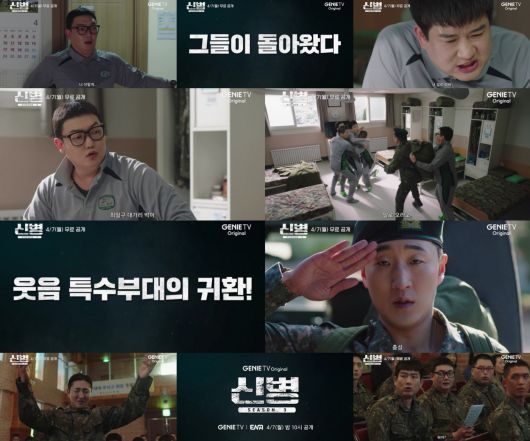 13일 지니 TV 오리지널 드라마 '신병3'(극본 윤기영, 강고은 /연출 민진기·조제욱/ 원작 장삐쭈) 측은 코믹 기강을 확실히 잡을 신병즈의 화끈한 컴백을 알리는 2차 티저 영상을 공개했다.