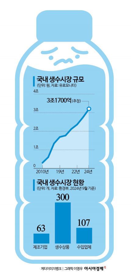 이후 생수시장은 매년 빠르게 성장했다. 글로벌 시장조사기관 유로모니터에 따르면 2010년만 생수시장 규모는 약 3000억원대까지 올라섰다. 2018년에는 처음 1조원을 돌파했고, 예상보다 2년 빠른 2021년에 2조원의 벽을 깼다. 2023년 기준 국내 생수시장은 크기는 2조7400억원에 달하는데 지난해에 3조원을 넘어섰을 거라는 게 유로모니터의 전망이다.