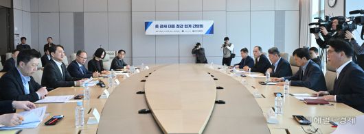 [헤럴드경제=임세준 기자] 안덕근(왼쪽 두 번째) 산업통상자원부 장관이 13일 오전 서울 강남구 포스코타워에서 열린 미국 관세 대응 철강 업계 간담회에 참석해 모두발언을 하고 있다.