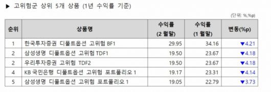 다음으로 △삼성생명 디폴트옵션 고위험 TDF1(19.50%) △우리투자증권 고위험 TDF2(19.50%) △KB국민은행 디폴트옵션 고위험 포트폴리오1(19.17%) △삼성생명 디폴트옵션 고위험 포트폴리오1(19.05%) 순으로 수익률이 높았다. 이 상품들 역시 전월 대비 3~4% 하락했다.
