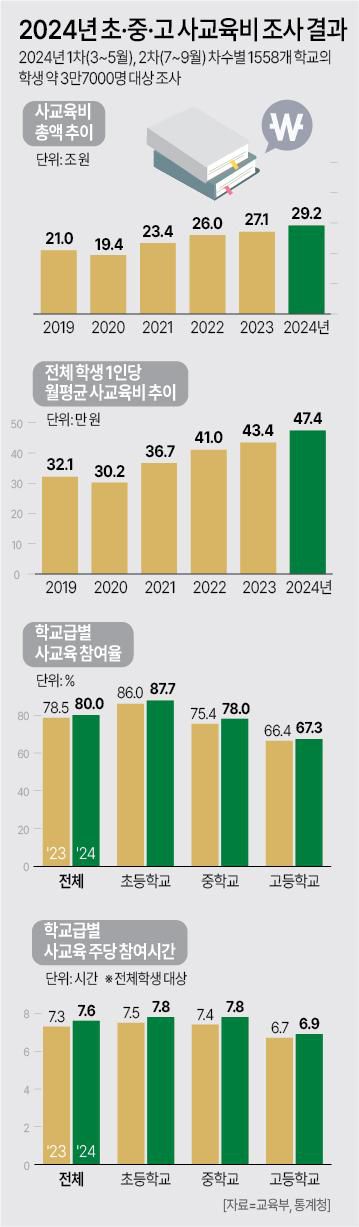 13일 통계청이 발표한 '2024년 초중고 사교육비 조사 결과'에 따르면 지난해 초중고 사교육비 총액은 지난해 29조2000억원으로 1년 만에 7.7%(2조1000억원) 늘었다. 지난해 평균 소비자물가 상승률(2.3%)과 비교할 때 사교육비 증가율이 3배 이상 높은 셈이다.