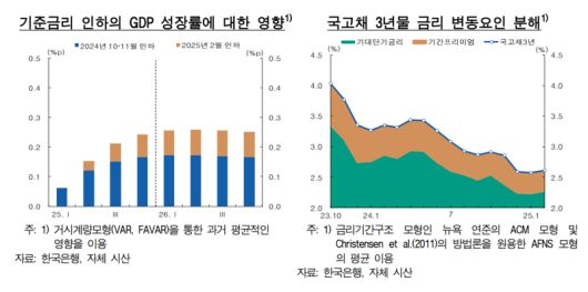 이에 장기금리가 기대단기금리를 중심으로 큰 폭으로 하락함에 따라 장기금리 경로의 경기부양 효과가 과거보다 크게 나타나고 있는 것으로 추정됐다. 실제 한은의 금리기간구조 모형 분석에 따르면 2023년 11월부터 2025년 2월중 3년물 국고채 금리는 142bp 하락하였는데 이중 기대단기금리 하락에 따른 변동분은 107bp로 추정됐다.