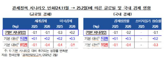 이에 한은이 미국 관세정책의 영향에 대한 다양한 시나리오를 가정해 봤다. 기본 시나리오의 경우 중국에는 현 수준의 관세를 유지하고, 여타 무역적자국에 대해서는 그보다 낮은 수준의 관세를 올해 중 부과하나 협상 진전으로 2026년에는 점진적으로 인하하는 경우다.