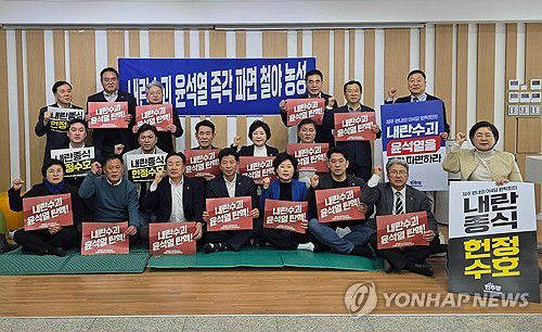 (제주=연합뉴스) 전지혜 기자 = 더불어민주당 소속 제주도의회 의원들이 13일 윤석열 대통령 파면을 촉구하는 철야 농성에 돌입했다.