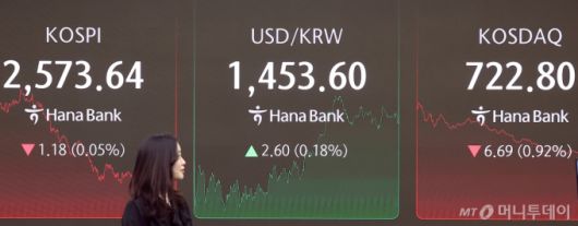 (서울=뉴스1) 김진환 기자 = 13일 오후 서울 중구 하나은행 본점 딜링룸 전광판에 증시가 표시되고 있다. 이날 코스피 지수는 전 거래일 대비 1.18p(0.05%) 하락한 2573.64, 코스닥 지수는 6.69p(0.92%) 하락한 722.80으로 마감했으며, 달러·원 환율은 2.60원 내린 1453.60원을 보이고 있다. 2025.3.13/뉴스1 Copyright (C) 뉴스1. All rights reserved. 무단 전재 및 재배포, AI학습 이용 금지. /사진=(서울=뉴스1) 김진환 기자 |