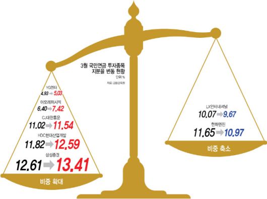 13일 금융감독원에 따르면 국민연금이 이달(3월3~13일) 보유지분 변경을 공시한 종목은 10개로 집계됐다. 이 중 2개 종목은 줄였고, 8개 종목의 비중은 확대했다.