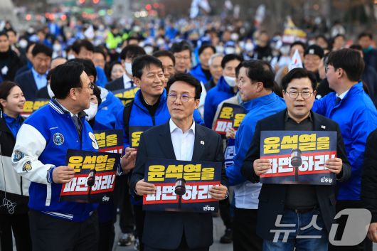 (서울=뉴스1) 박정호 기자 = 박찬대 더불어민주당 원내대표와 김민석 수석 최고위원을 비롯한 의원들이 13일 오후 서울 종로구 광화문광장에서 윤석열 대통령 파면 촉구 도보행진을 하고 있다. 2025.3.13/뉴스1pjh2035@news1.krCopyright ⓒ 뉴스1. All rights reserved. 무단 전재 및 재배포, AI학습 이용 금지.