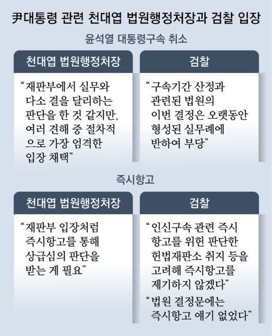 검찰이 윤석열 대통령의 구속을 취소한 법원 결정에 대해 항고하지 않겠다는 방침을 13일 재확인했다. 천대엽 법원행정처장이 전날 국회에 출석해 “즉시항고로 상급심 판단을 받아볼 필요가 있다”고 밝히자 간부들의 의견을 수렴하며 재검토에 나섰지만, 헌법재판소의 위헌 결정 가능성을 고려해 항고를 포기하는 방침을 유지하기로 한 것이다.