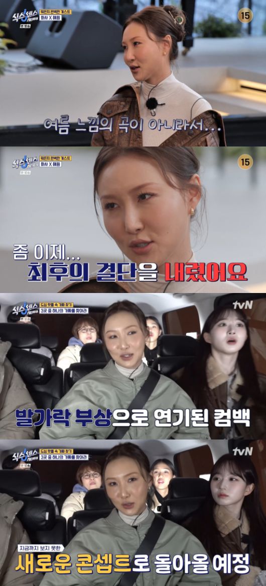 화사는 신곡에 대해 "곡은 다 만들었는데 이게 일단 제가 발가락이 부러졌다. 그 이슈도 있고 팝 발라드 같은 느낌인데 안 보여드렸던"이라며 궁금증을 불러일으켰다.