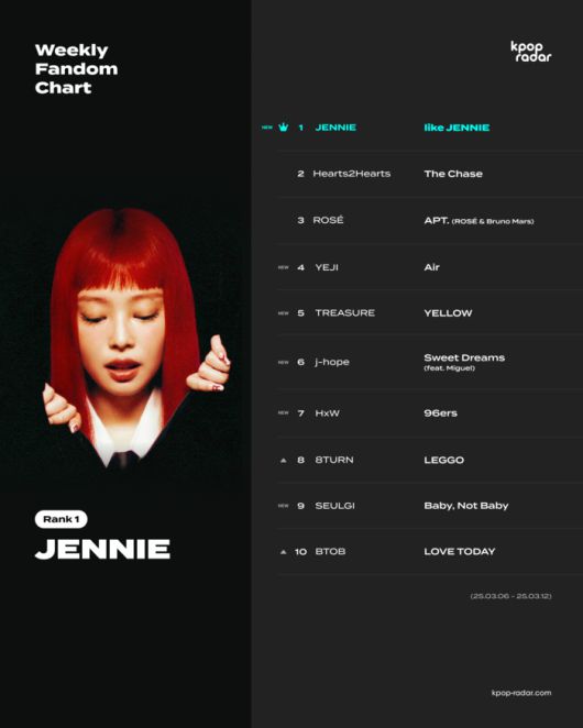 14일 ‘케이팝레이더’는 한 주간 가장 두드러진 성장을 보인 아티스트를 분석하는 증감률 기반 차트인 ‘위클리 팬덤 차트’를 발표했다. 해당 차트에서 제니가 신곡 ‘라이크 제니(like JENNIE)’로 1위에 등극했다.