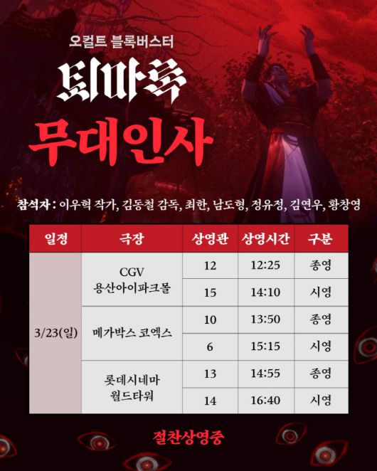 ‘퇴마록’은 천 만 베스트셀러 소설 ‘퇴마록’(작가 이우혁)을 원작으로 한 탄탄한 스토리와 성우들의 훌륭한 열연, 고퀄리티 작화와 액션 연출까지 ‘K오컬트’의 장르적인 재미를 최상으로 뽑아냈다는 극찬을 받으며 장기 흥행 중이다. ‘퇴마록’이 최근 누적 40만 돌파를 기념하며 3월 23일(일) 퇴마사 4인과 서교주, 그리고 원작자 이우혁 작가과 김동철 감독이 함께하는 감사 무대인사를 전격 확정했다.