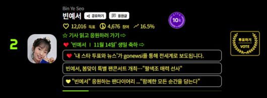 한편 빈예서는 3월 네티즌 어워즈 여자가수상 2위에서 맹활약하고 있다. 14일 오후 6시 3분 현재 12016득표를 했다.