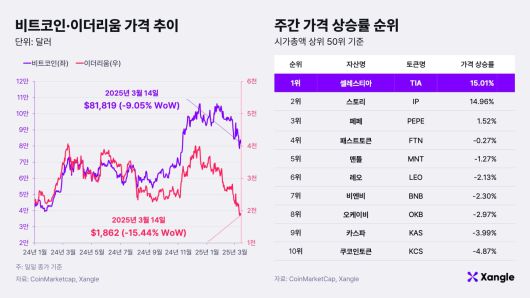 비트코인·이더리움 가격 추이와 주간 가격 상승률 순위(지난 14일 오전 10시 기준) /쟁글 제공 |