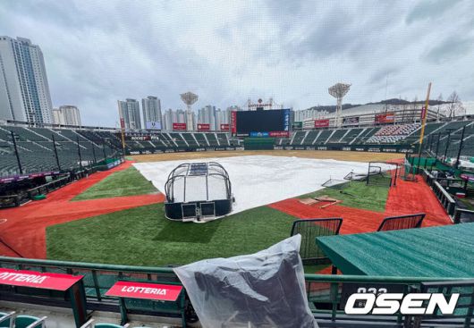 [OSEN=부산, 이석우 기자] 15일 부산 사직야구장에서 2025 신한 SOL 뱅크 KBO 리그 롯데 자이언츠와 KT 위즈의 시범경기가 열릴 예정이다. 오전부터 내린 비로 경기가 진행될 수 있을까?계속해서 내리는 비로 사직야구장에 방수포가 씌워져 있다. 2025.03.15 / foto0307@osen.co.kr |