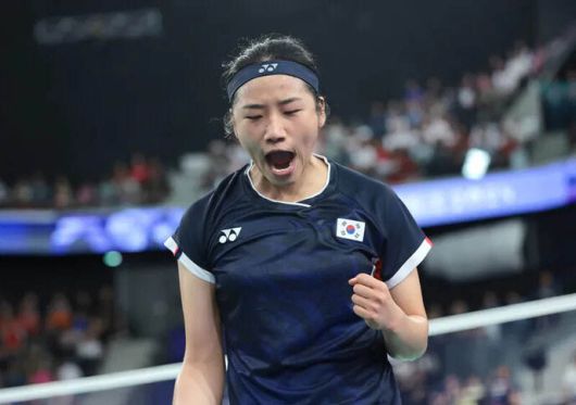 한국 배드민턴 국가대표 안세영이 지난해 8월4일(현지시각) 프랑스 파리 라 샤펠 아레나에서 열린 2024 파리올림픽 배드민턴 여자 단식 4강에서 인도네시아 그레고리아 마리스카 툰중에를 상대로 득점한 뒤 기뻐하고 있다. 파리/연합뉴스 |