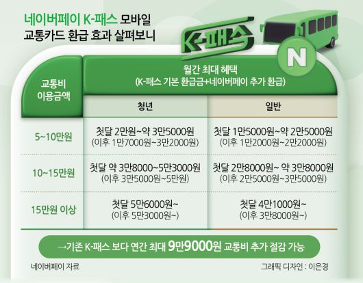 지난해 K-패스 이용자들은 월 평균 1만8000원을 돌려받은 것으로 집계됐는데, 네이버페이를 이용하면 총 2만원의 환급 효과를 낼 수 있다. 여기에 신규 등록한 첫달엔 3000포인트를 더 얹어준다.