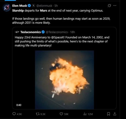 (서울=연합뉴스) 2025년 3월 14일(현지시간) 일론 머스크 스페이스X 최고경영자(CEO)가 소셜미디어 X에 "스타십이 내년 말에 옵티머스를 태우고 화성으로 출발한다. 만약 이 때 착륙이 잘 된다면, 유인 착륙이 이르면 2029년에도 시작될 수 있다. 다만 2031년일 가능성이 더 크다"고 올린 게시물. [@elonmusk X 게시물 캡처. DB 및 재판매 금지] 2025.3.15. |
