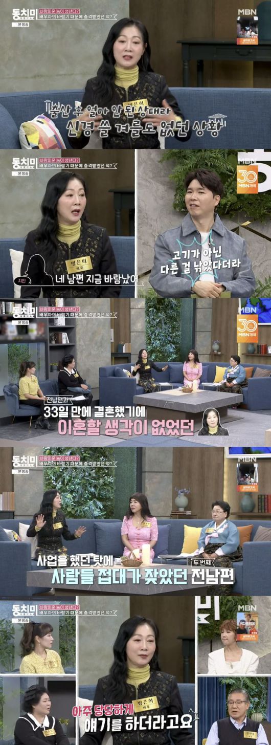 먼저 방은희는 속전속결로 결혼한 첫 남편이, 자신의 출산 후 불륜을 저질렀다고 밝혔다. 그는 "아이 낳은지 얼마 안 됐는데 낚시터를 가겠다더라. 그러라고 했는데 거기서 어떤 여자를 만났나보더라. 그걸 저한테 들키지는 않았다. 들키고 말고 할 만큼 신경쓸 수도 없었다"고 말문을 열었다.
