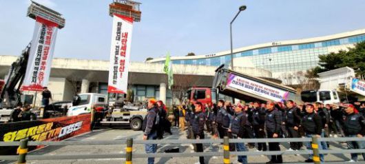 공공운수노조 화물연대본부(화물연대)와 전국건설노동조합(건설노조) 소속 조합원들이 지난 7일 정부세종청사 국토교통부 앞에서 윤석열 대통령 파면 촉구와 안전운임제 도입 및 건설노조 탄압 중지 등을 촉구하고 있다. 연합뉴스 |