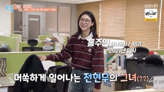 홍주연 아나운서는 16일 방송된 KBS2 '1박2일'에 출연했다. 이날 아나운서 국을 방문한 이준과 딘딘은 홍주연의 이름을 보고 "이분이 바로 그..."라고 언급했고, 마침 자리에 있던 홍주연 아나운서는 이들과 인사를 나눴다.
