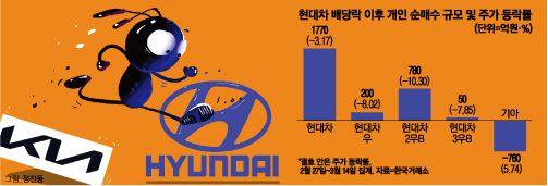 16일 한국거래소에 따르면 개인투자자들은 현대차의 배당락일인 지난달 27일부터 이달 14일까지 기아를 760억원어치 순매도했다.