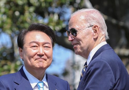 미국을 국빈 방문한 윤석열 대통령이 지난 2023년 4월(현지시간) 워싱턴DC 백악관에서 열린 공식 환영식에서 조 바이든 미국 대통령과 두 손을 맞잡고 있다. [사진 = 연합뉴스] |