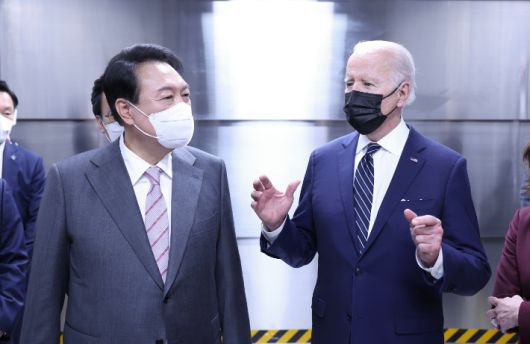 지난 2022년 당시 조 바이든 미국 대통령이 윤석열 대통령과 경기도 평택시 삼성전자 반도체공장을 시찰하는 모습. 연합뉴스 |