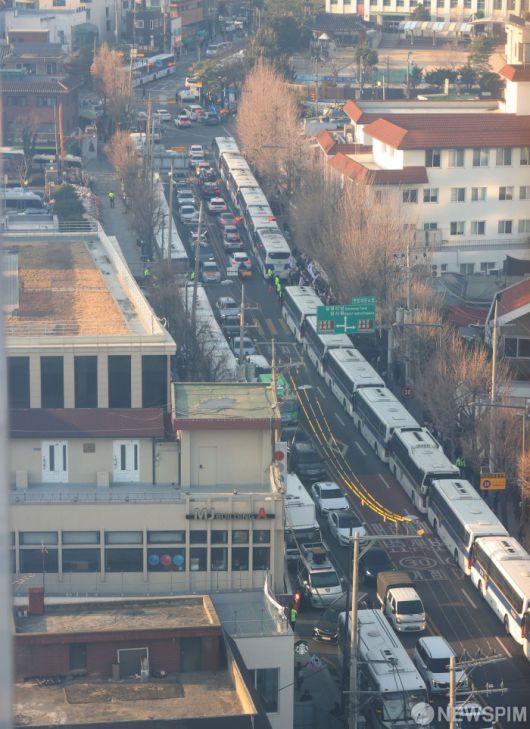 [서울=뉴스핌] 이호형 기자 = 윤석열 대통령에 대한 탄핵심판 선고가 임박한 가운데 16일 오후 경찰이 헌법재판소 주변에 버스 차벽을 설치해 놓고 있다. 2025.03.16 leemario@newspim.com |