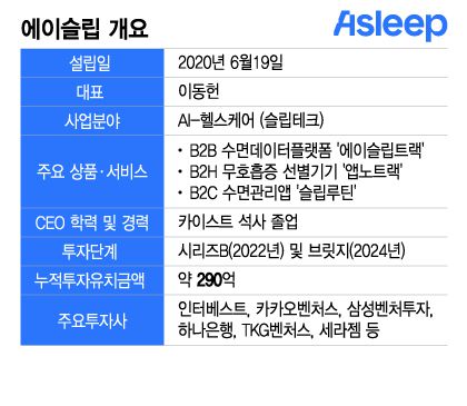 2020년 설립된 에이슬립의 이동헌 대표는 최근 머니투데이 스타트업 미디어 플랫폼 유니콘팩토리와 인터뷰에서 "의사들 사이에서도 편안한 환경에서 수면 데이터를 확보해야 한다는 의견이 계속 제기되면서 앱노트랙 도입 여부를 검토하는 병원이 늘고 있다"고 말했다.