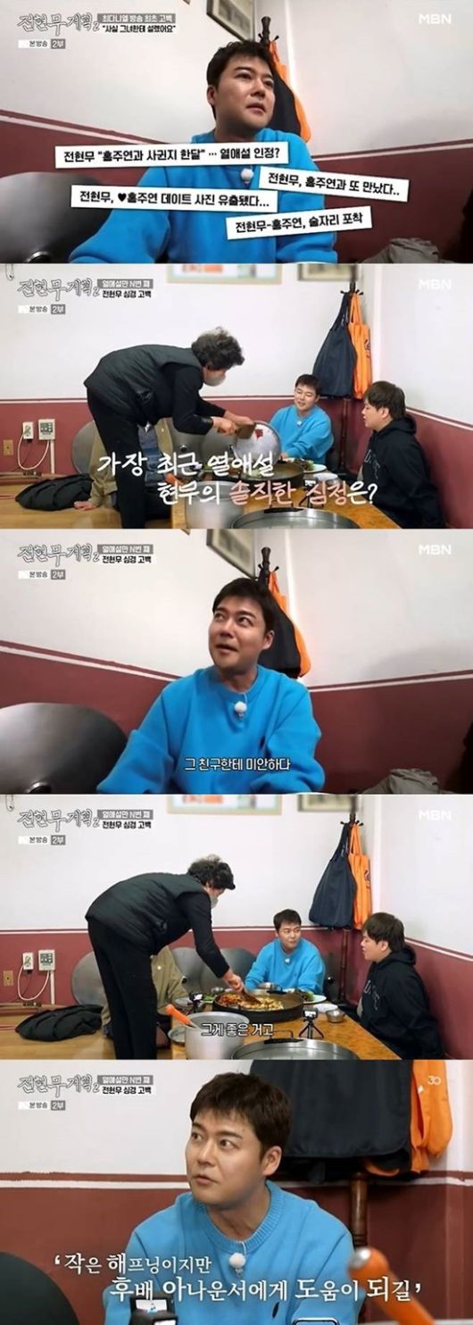 전현무는 "나는 그걸(열애설) 통해서 그 친구가 주목이 되니까 그게 좋은 것이다. 방송환경이 옛날같지 않아서 신입 아나운서가 사실 주목받기 쉽지 않다. 이렇게라도 네가 알려지면 된거 아니냐. (상대방도) 'OK' 하고 있는 상황인 것이다"라고 설명했다.