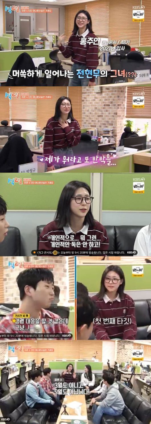 멤버들이 KBS 안에서 미션을 수행하게 된 가운데, 딘딘과 유선호는 아나운서실을 찾았고 전현무의 열애설 주인공으로 화제를 모았던 홍주연을 마주했다.