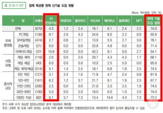 게임백서에는 인공지능 기술을 도입한 게임사는 4.3%이며, 현재 기술 도입 없음이라고 답한 게임사는 74%에 달했다. 반면 VR/AR기술은 18%에 달했는데, 인공 지능보다는 VR/AR 기술 인력이 더 많기 때문인 것으로 풀이된다.