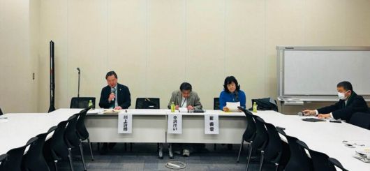 지난 13일 일본 도쿄 중의원(하원) 제 2의원회관에서 열린 가와카미 시로 ‘가와카미 법류사무소’ 변호사, 나카자와 게이 호세이대 교수, 최선애 슈칸 킨요비 편집위원, 야노 히데키 ‘강제동원 문제해결과 과거청산을 위한 공동행동’ 사무국장(왼쪽부터)이 자리하고 있다.