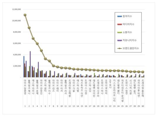 4위, 블랙핑크 로제 브랜드는 참여지수 894,551 미디어지수 840,697 소통지수 1,527,126 커뮤니티지수 2,720,650이 되면서 브랜드평판지수 5,983,023으로 분석됐다. 지난 2월 브랜드평판지수 10,417,315와 비교해보면 42.57% 하락했다.