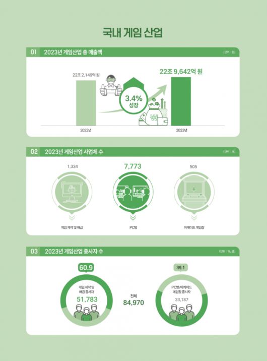 보고서에 따르면 2023년 국내 게임시장의 성장률 자체는 둔화했지만, 게임산업 규모는 꾸준히 성장을 이어갔다. 2023년 국내 게임산업 매출액은 전년 대비 3.4% 증가한 22조 9,642억 원으로 집계되었으며, 수출액은 83억 9,400만 달러(한화 약 10조 9,785억 원*)로 전년 대비 6.5% 감소했다.(*한국은행 2023년 연평균 매매 기준율 1,307.90원 적용)