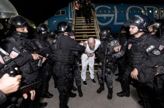엘살바도르 경찰이 최근 미국에서 추방된 뒤 엘살바도르로 호송된 베네수엘라 갱단원들을 교도소로 이송하기 위해 통제하고 있다. 나이브 부켈레 엘살바도르 대통령 제공 |