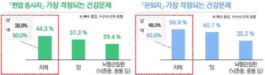 이번 조사에서 현업 종사자(30~59세)와 은퇴자(55~75세) 모두 치매에 대한 걱정이 큰 것으로 나타났다. 현업 종사자 44.3%, 은퇴자 55.9%가 이같이 답했다. 이어 암(현업 종사자 37.3%·은퇴자 50.7%), 뇌혈관질환(현업 종사자 29.4%·은퇴자 35.2%)이 뒤를 이었다.