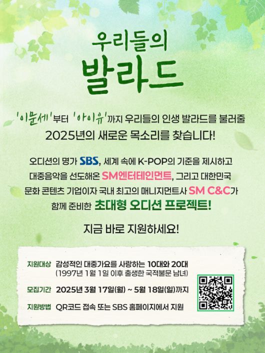 한편, '우리들의 발라드'에서는 이번 프로젝트에 도전할 참가자 모집을 시작한다. 오늘(17일)부터 '우리들의 발라드' SBS 공식 홈페이지(https://programs.sbs.co.kr/enter/theballad)를 통해 지원할 수 있다.