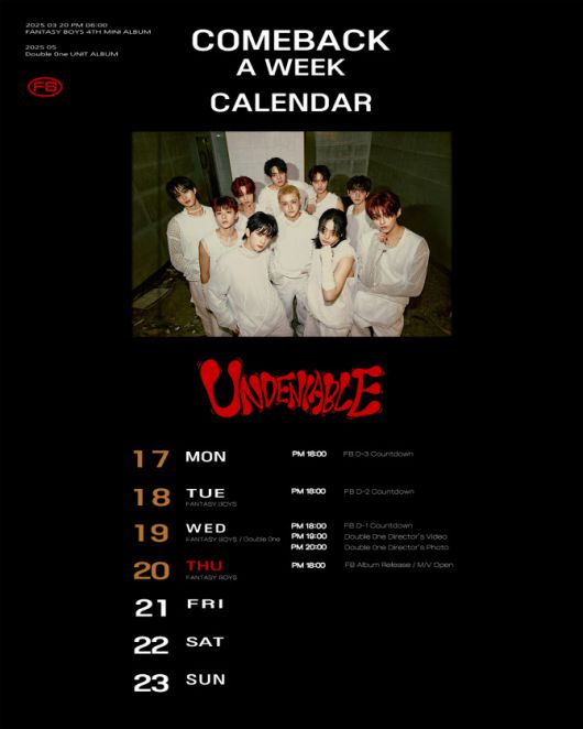 [이데일리 스타in 윤기백 기자] 그룹 판타지 보이즈(FANTASY BOYS)가 오는 20일 미니 4집 ‘언디나이어블’(UNDENIABLE)의 발매를 앞두고 컴백 스케줄러를 공개했다