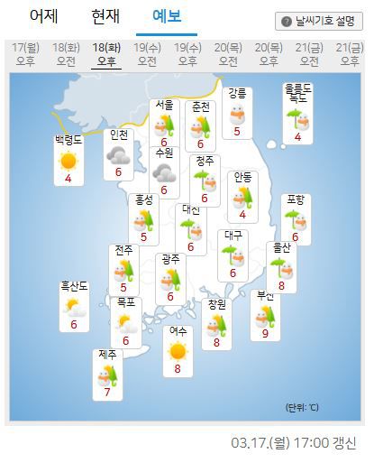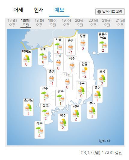 17일 기상청에 따르면 오는 18일, 중국 북부에서 확장하는 찬 대륙고기압의 영향으로 17일 늦은 오후부터 전국 대부분 지역에서 많은 비 또는 눈이 내리고, 강원 일부 지역에서는 15cm 이상의 많은 눈이 쌓일 가능성이 있다고 예보했다.