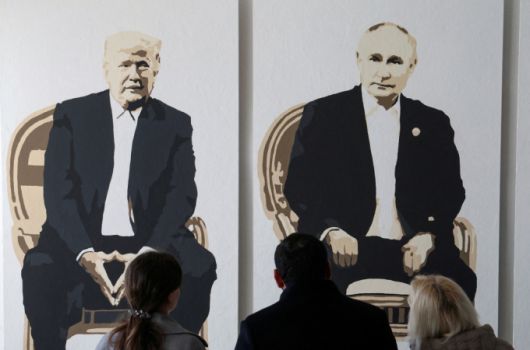 러시아가 점령한 지역인 크름반도 얄타에 있는 리바디아 공원 미술관에서 관람객들이 도널드 트럼프 미국 대통령과 블라디미르 푸틴 러시아 대통령을 묘사한 작품을 감상하고 있다. /로이터=뉴스1 |
