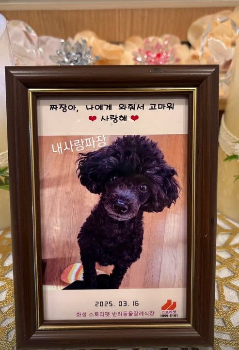 함께 공개한 사진 속에는 “짜장아, 나에게 와줘서 고마워. 사랑해”라는 문구가 적힌 액자와 짜장이의 모습이 담겨 있어 보는 이들을 뭉클하게 한다.
