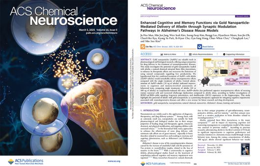 관련 내용은 ‘금 나노입자로 처리한 아프젤린의 알츠하이머병 인지능 개선효과(Enhanced Cognitive and Memory Functions via Gold Nanoparticle Mediated Delivery of Afzelin through Synaptic Modulation Pathways in Alzheimer’s Disease Mouse Models)’라는 논문이다.