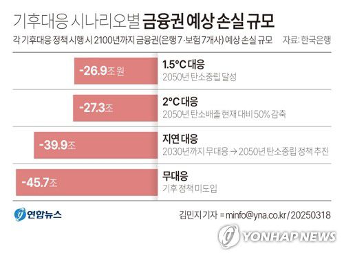 (서울=연합뉴스) 한지훈 기자 = 기후변화 리스크(위험)에 대응하지 않을 경우 은행과 보험사 등 금융기관들의 손실이 크게 확대될 수 있다는 연구 결과가 나왔다.