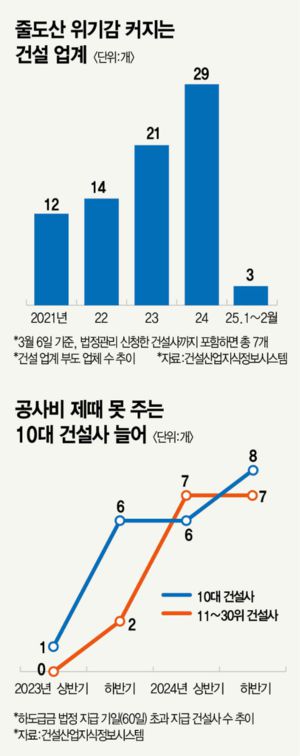 올 1월 신동아건설(시공능력평가 58위)과 대저건설(103위)에 이어 지난 2월 24일에는 국내 건설면허 1호 보유 기업인 삼부토건(71위)과 안강건설(138위)이, 27일에는 ‘엘크루’ 브랜드로 알려진 대우조선해양건설(83위)이 법정관리를 신청했다. 대우조선해양건설은 2022년 법정관리 절차를 밟은 뒤 스카이아이앤디에 인수돼 지난해 말 회생절차를 졸업했지만 스카이아이앤디가 경영권을 포기하며 결국 다시 법정관리 수순을 밟게 됐다. 대우조선해양건설과 같은 날 ‘삼정그린코아’ 브랜드로 알려진 삼정기업(114위·삼정이앤씨 포함)도 법정관리를 신청했다. 이어 지난 3월 4일에는 ‘벽산블루밍’ 브랜드로 알려진 벽산엔지니어링이 중견 건설사 법정관리 행렬에 이름을 올렸다.