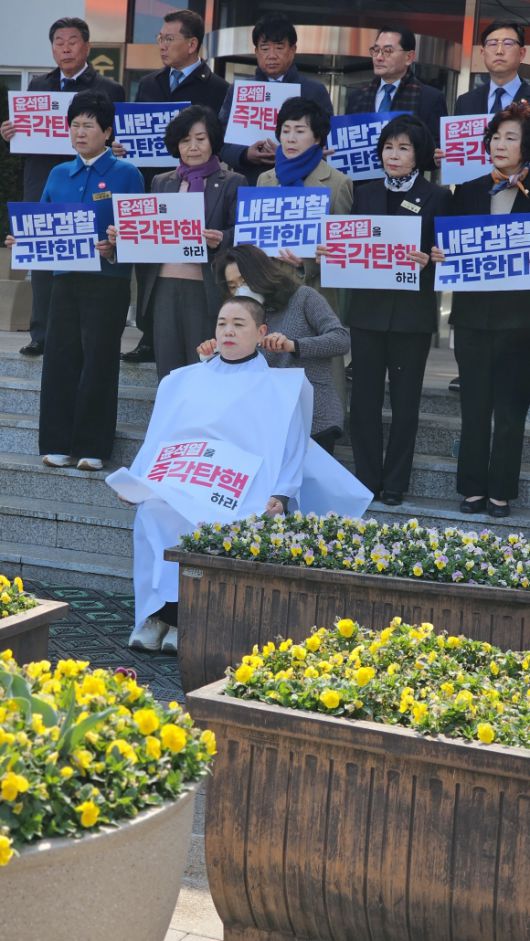 김미연 순천시의원이 순천시청 앞에서 윤석열 즉각 파면을 촉구하며 삭발식을 강행했다. |