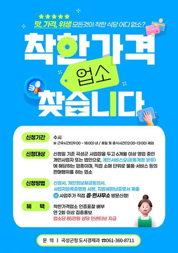 조상래 곡성군수는 "급격한 경기 악화에도 불구하고 물가안정을 위해 힘쓰는 소상공인을 착한가격업소로 지정해 많은 사람이 이용할 수 있도록 적극적으로 홍보하고 실질적인 혜택도 제공할 계획이다. 사업주는 물론 지역민들의 많은 관심과 추천을 부탁드린다"라고 말했다.