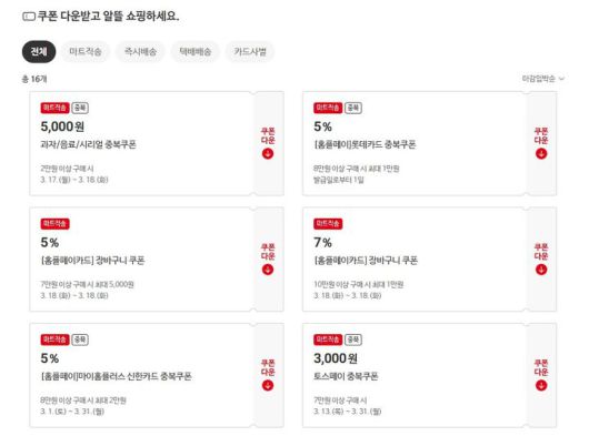 이날 현재 홈플러스 홈페이지에서 다운받을 수 있는 쿠폰은 총 16개로 5000원 할인쿠폰부터 7% 장바구니 쿠폰까지 다양하다.